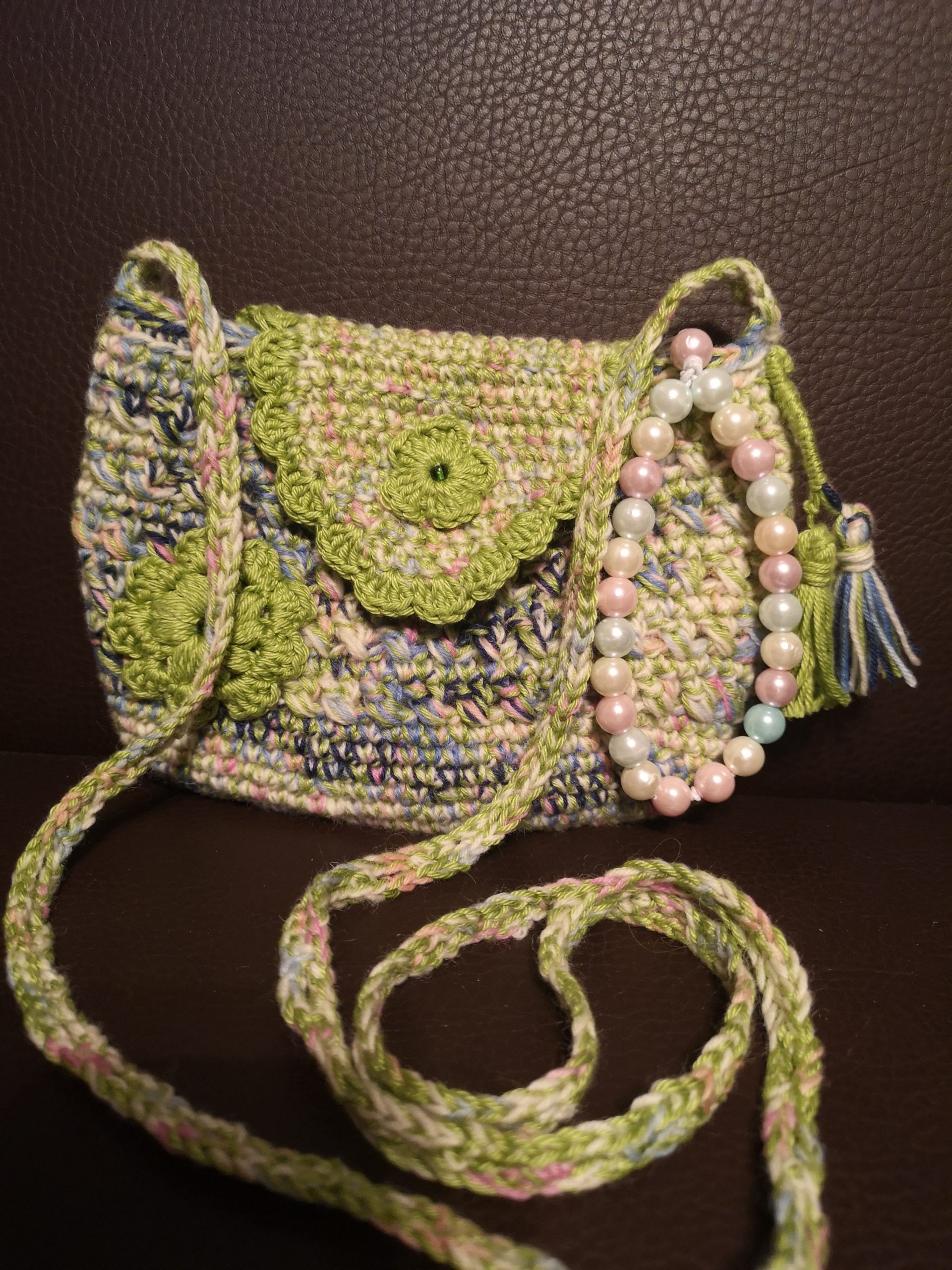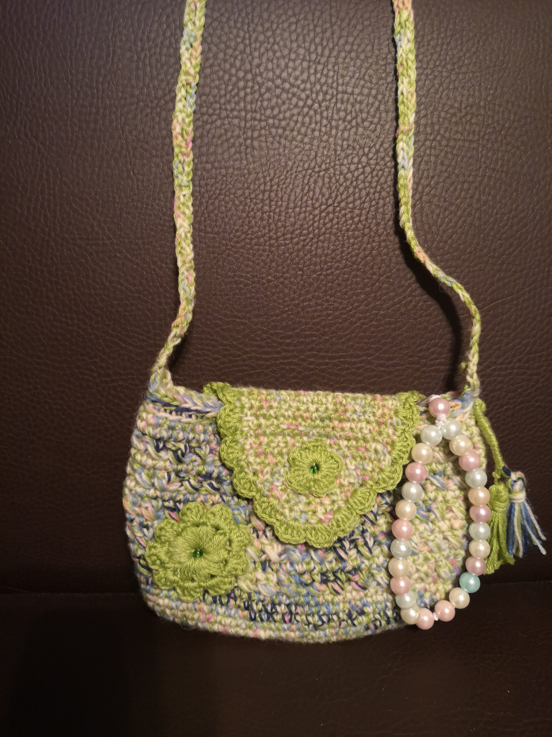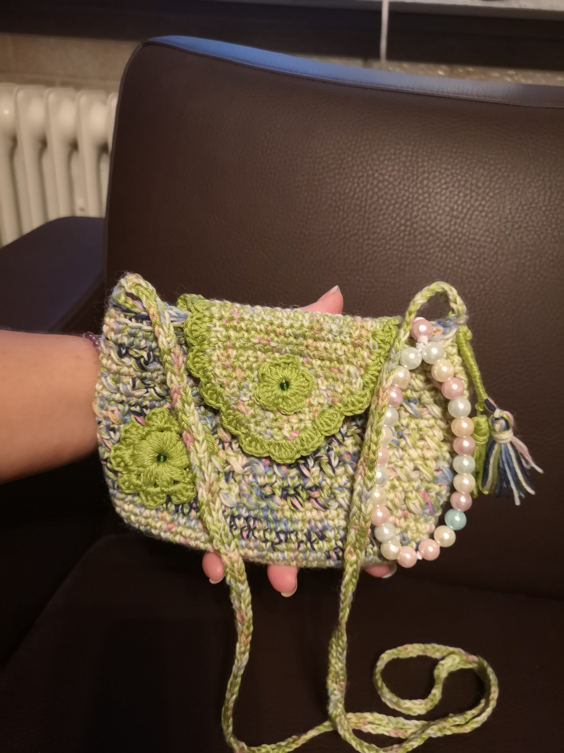 Torbica je unikat i od vunice pamuk. Mala torbica veličine. Dužina 20cm.visina 15cm.remen 120cm.postava pamuk. Gratis ručni rad privjesak za mobitel.